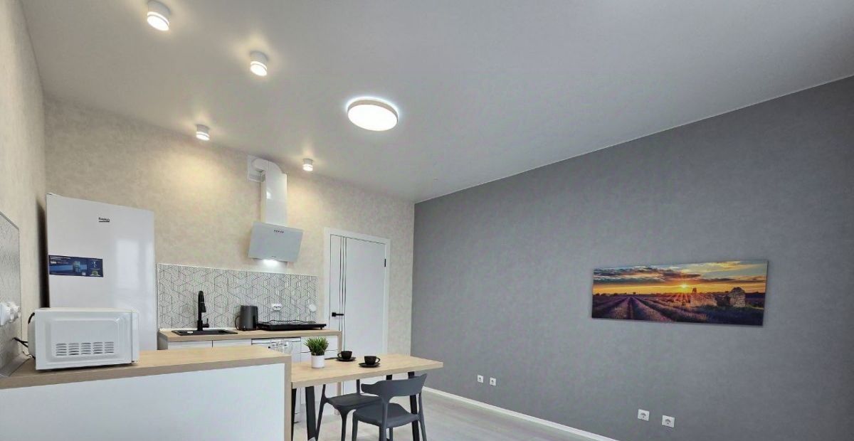Кухня-гостиная. Точнее гостиная и кухня, т.к. визуально кухня не привлекает внимания и во время отдыха на удобном диване вы будете чувствовать себя не на кухне на диване, а именно в гостиной! Стол является продолжением кухни, но он легко передвигается и к дивану, когда придут ваши гости. Вся необходимая техника есть: холодильник, посудомоечная машина, плита, микроволновка, чайник, вытяжка. Выход на остекленную лоджию.