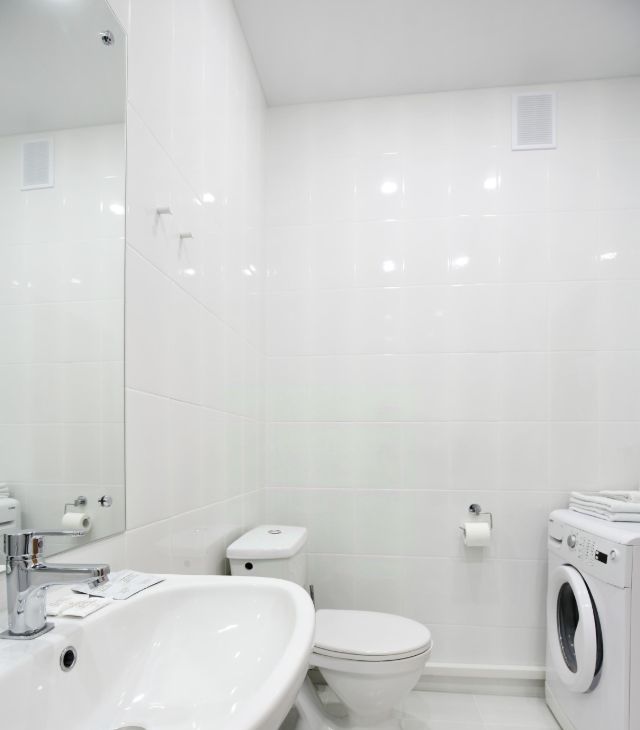 Санузел оснащён современной сантехникой, стиральной машиной и феном