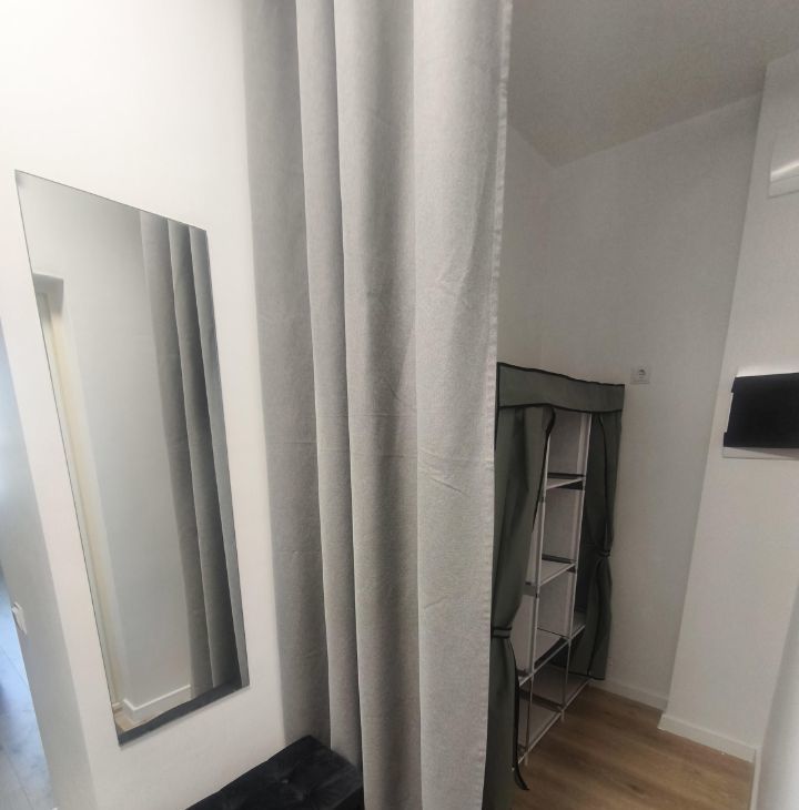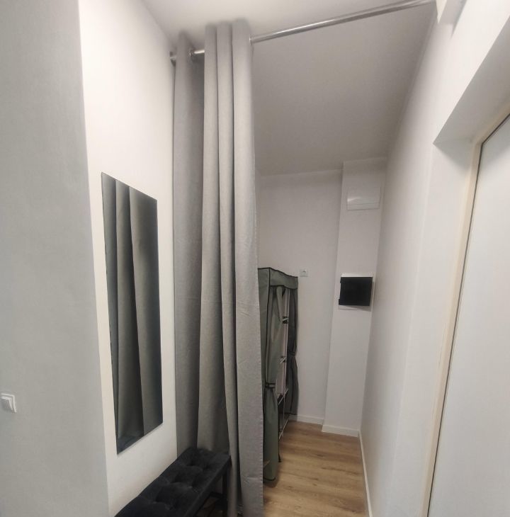 В прихожей зона гардеробной с удобным пуфиком и зеркалом