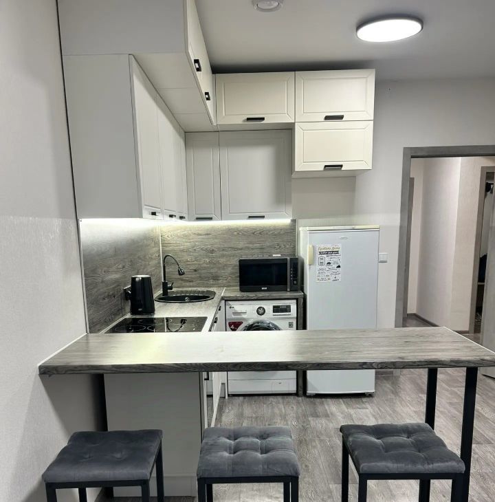 Кухня оборудована необходимой техникой: холодильник, плита, микроволновая печь и стиральная машина. В гостиной установлен удобный, раскладной диван и обеденный стол.