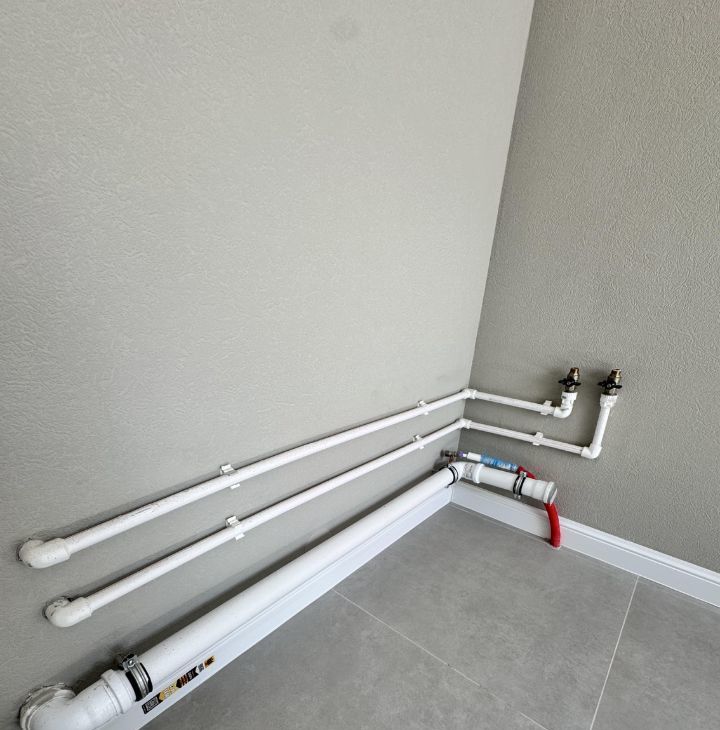 В квартиру заведено 3 трубы: ХВС,ГВС и питьевая. В кухне проведен вывод под кондиционер.