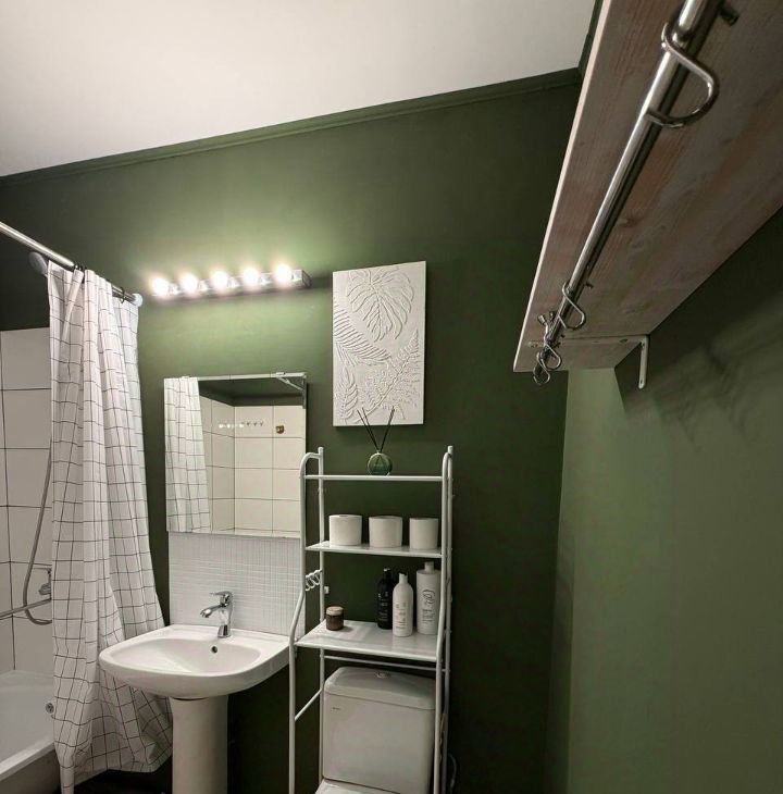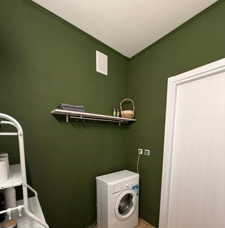Ванная комната оснащена ванной, что позволит вам расслабиться после трудового дня. Есть стеллаж для хранения, стиральная машина.