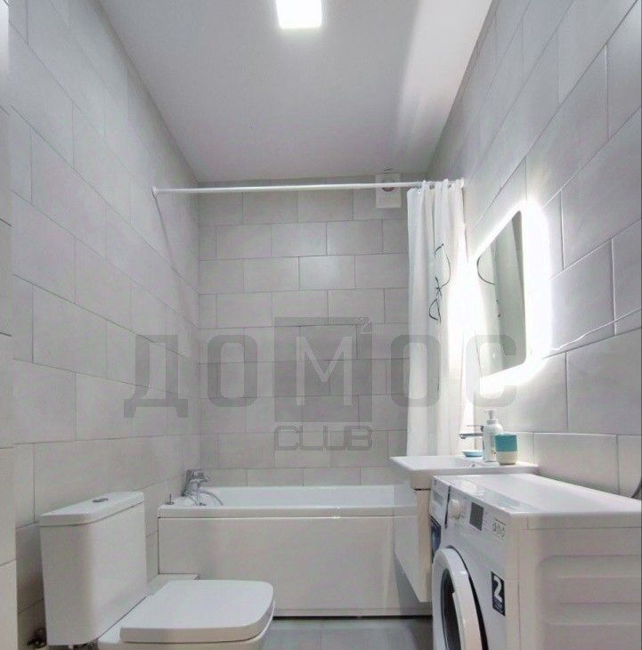 Совмещенный санузел в светлых тонах со стиральной машиной, ванной