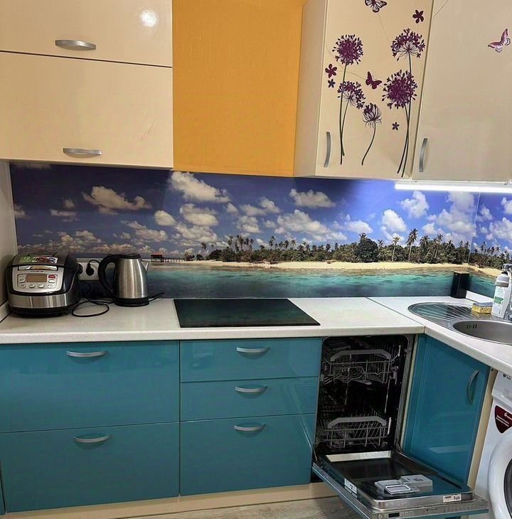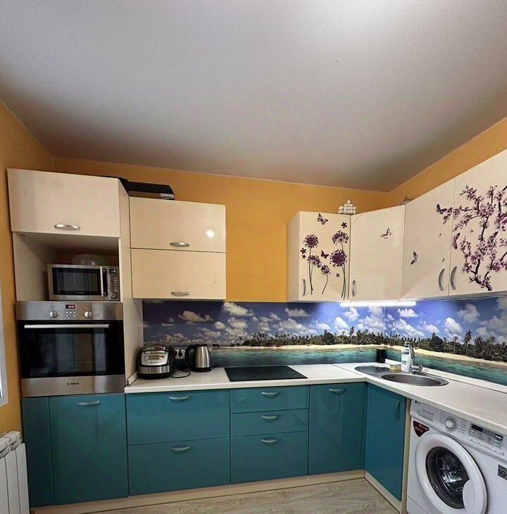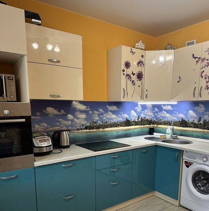 Кухня просторная, площадью 13 кв.м., оборудована всем необходимым: холодильник, посудомойка, стиральная машина, микроволновая печь, плита и духовой шкаф, мультиварка.