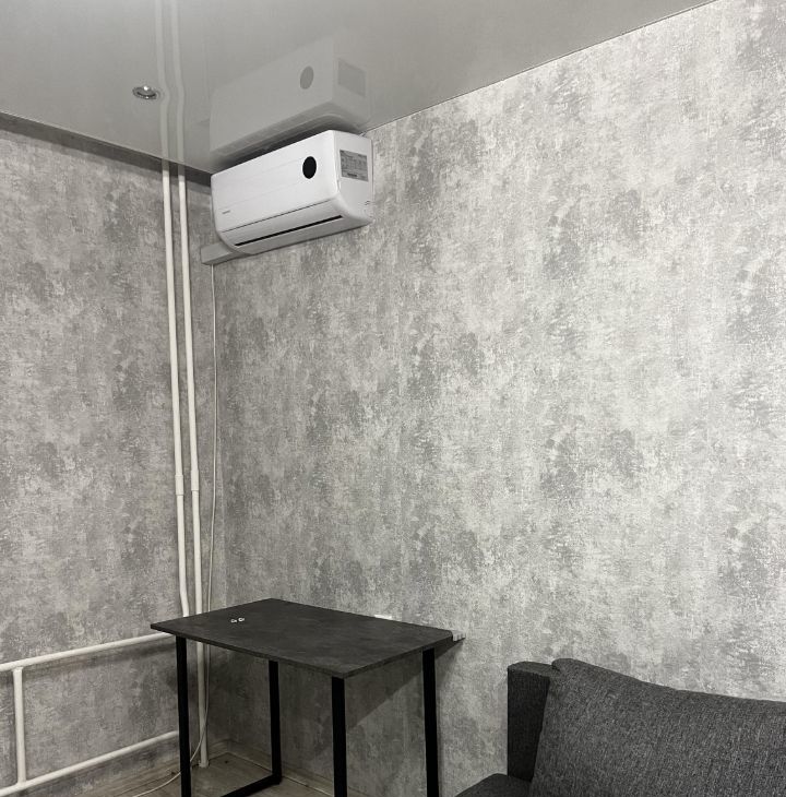 В ванной комнате имеется раковина с большой тумбой и зеркалом. В основной комнате установлен кондиционер, большой встроенный шкаф-купе, диван и стол.