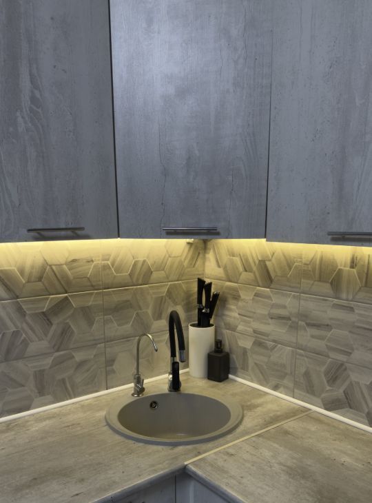 Кухонный гарнитур с варочной поверхностью, вытяжкой и духовым шкафом.