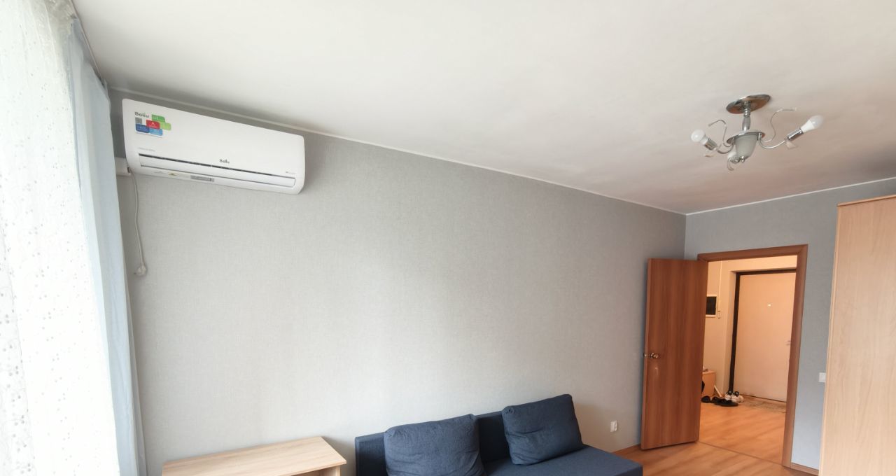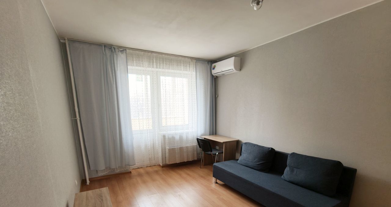 **Комната** также после свежего ремонта — новые стены и потолок, удобный диван, тумба и стол. Для комфорта установлен кондиционер, шкаф.