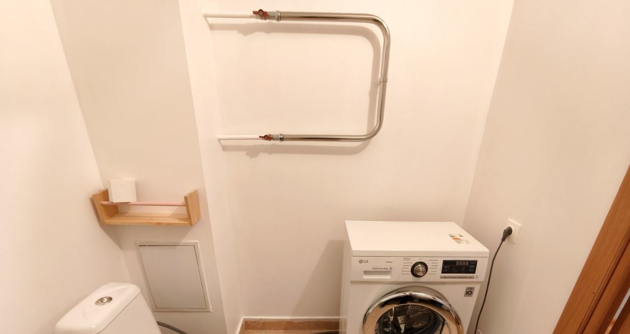 **Прихожая и ванная комната** радуют глаз новой отделкой стен и потолка. В прихожей — практичная вешалка для одежды, а в ванной — стиральная машина.