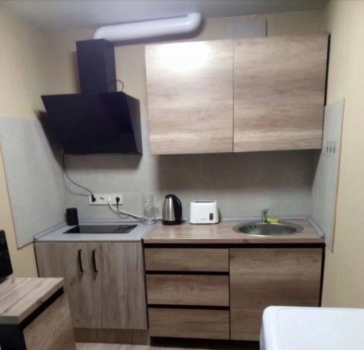 вытяжка..микроволновка..холодильник..стиральная машинка..индукционная плита..чайник..пылесос..тостер..кухонный стол..три табуретки..диван..телевизор..стенка с вместительными шкафами..декорное растение..