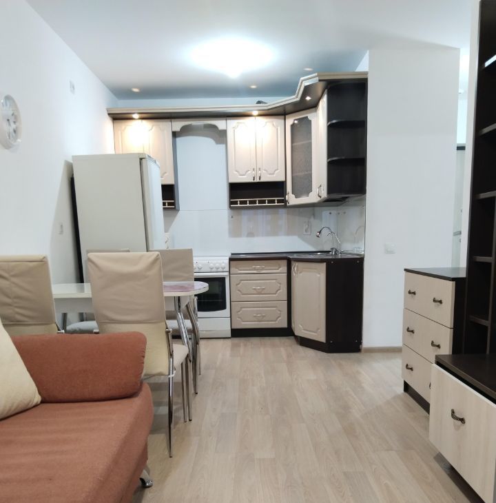Сдается уютная однокомнатная квартира в новом доме 2022 года постройки. Общая площадь — 36.7 кв. м, из них просторная кухня -гостинная — 17 кв. м и жилая комната — 11.35 кв. м. Квартира расположена на 5 этаже 12-этажного дома. Закрытый двор оборудован детскими площадками.