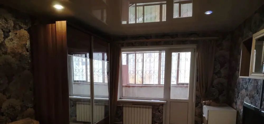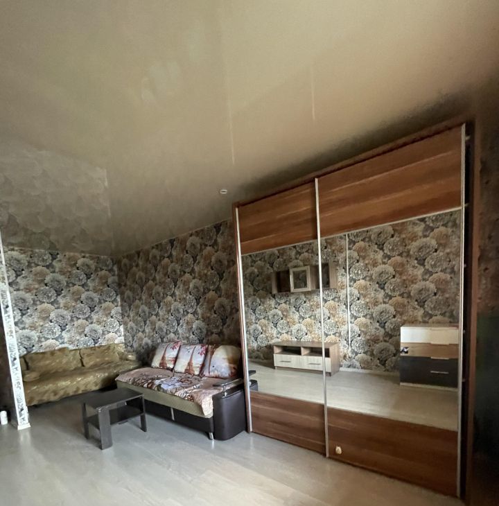 В комнате установлены шкафы и диван, создавая комфортное пространство для отдыха. Из окон открывается вид на тихий двор, где расположена детская и спортивная площадки. Для автомобилей предусмотрена открытая парковка во дворе.