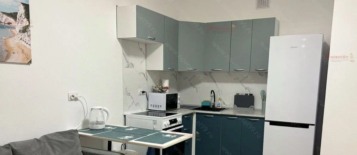 В квартире есть вся необходимая мебель и техника. Отличный вариант для любителей комфорта. Удобная кухня-гостиная в современном стиле и комната с большой кроватью.