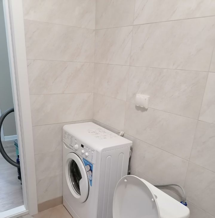 Санузел совмещенный, оснащен стиральной машиной, и зеркалом