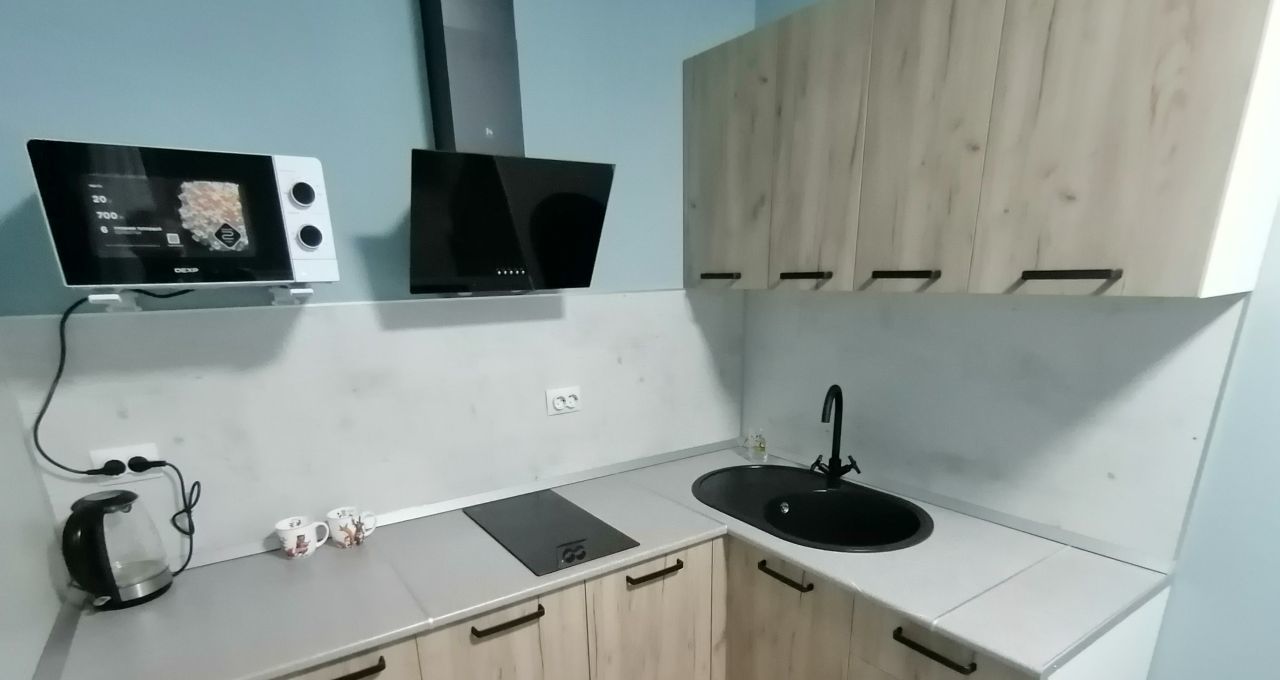Кухня оборудована всем необходимым: встроенная стеклокерамическая электроплита, СВЧ-печь, холодильник, большой кухонный стол со стульями.