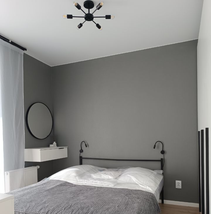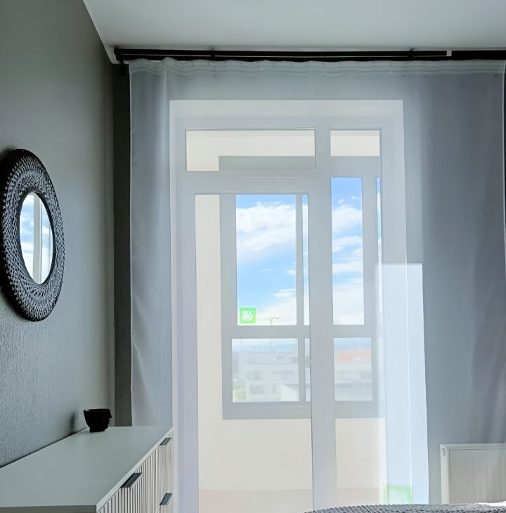в спальне кровать с ортопедическим матрасом, вместительный шкаф, комод, туалетный столик с зеркалом, плотные блекаут шторы для комфортного отдыха;