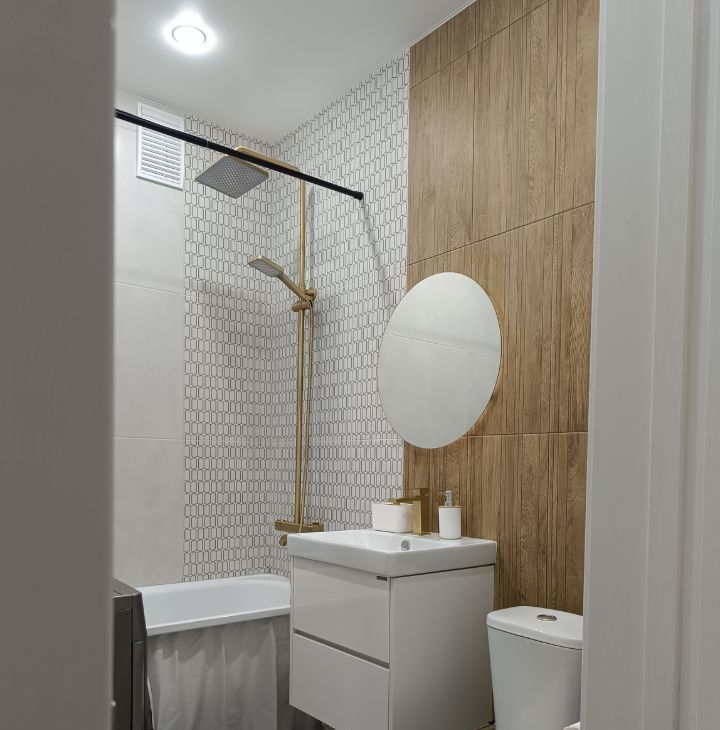 в ванной комнате душ с термостатом, теплый пол, стиральная машина с сушкой, зеркало с подсветкой;