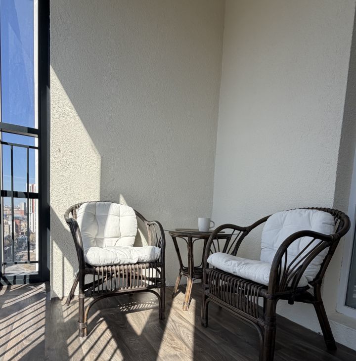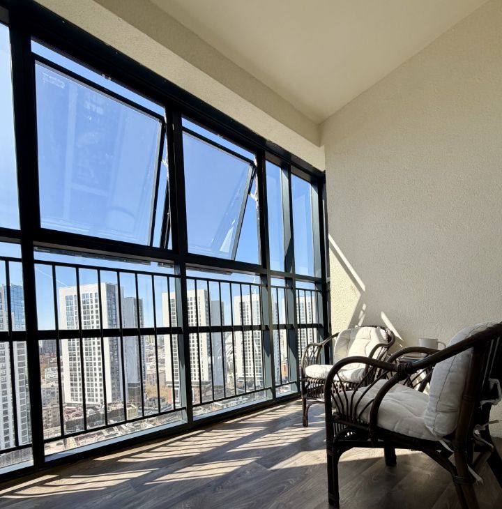 Окна выходят на запад, красивый вид на город, мягкое вечернее освещение и красивые закаты. Большая уютная лоджия для релакса.