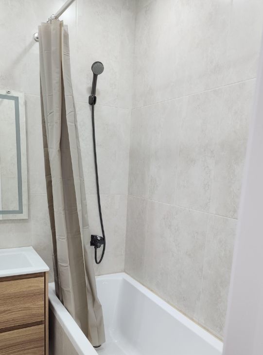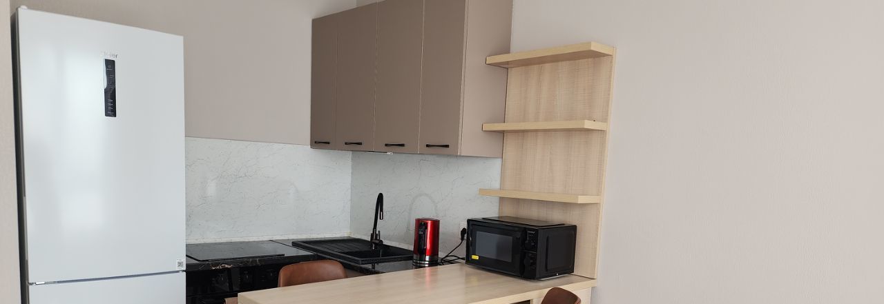 Кухня оснащена всем необходимым: холодильник, микроволновая печь и плита,духовка. Имеется обеденный стол с двумя стульями. Ванная комната совмещенная, с современной сантехникой и стиральной машиной.