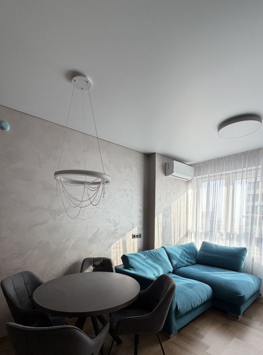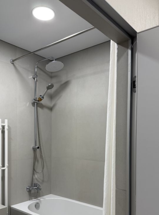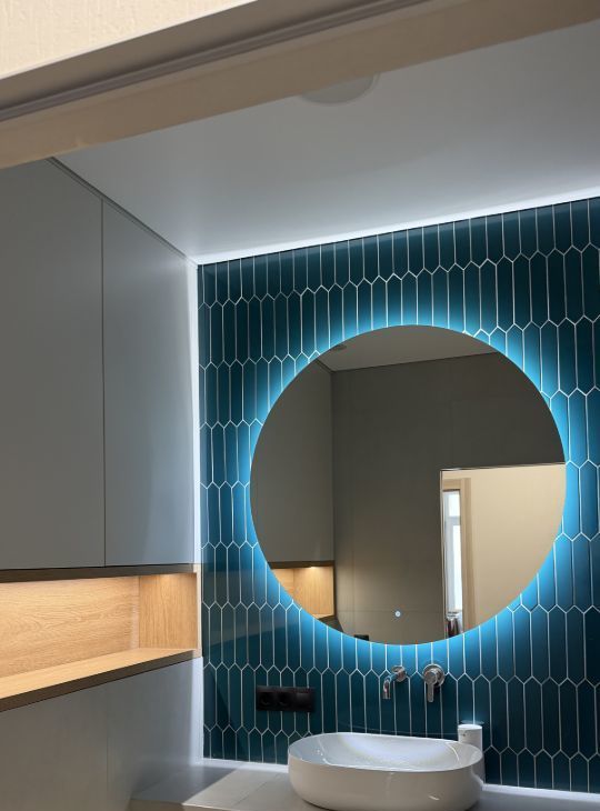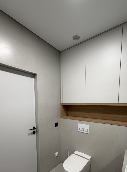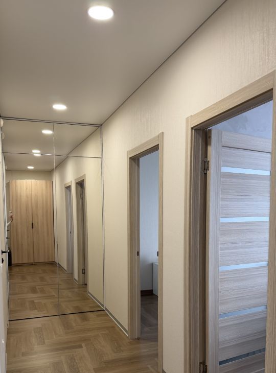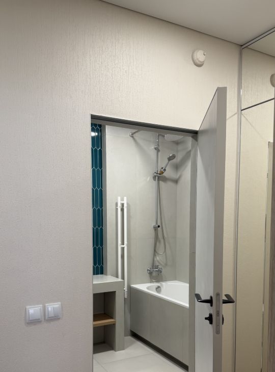 В квартире выполнен качественный ремонт. На полу кварц винил елочка. В санузле установлен тёплый пол, унитаз со встроенной функцией биде, предусмотрено несколько вариантов подсветки: подсветка зеркала, подсветка полок и подсветка в зоне ванны.