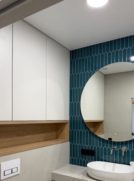 В коридоре установлен вместительный зеркальный шкаф, выполненный на заказ (глубина 75 см). В шкафу размещены стиральная машина и водонагреватель. Предусмотрены полки для бытовой химии и текстиля, отдельный отсек для гладильной доски и сушилки, розетка для вертикального пылесоса, а также верхние ящики для хранения вещей.