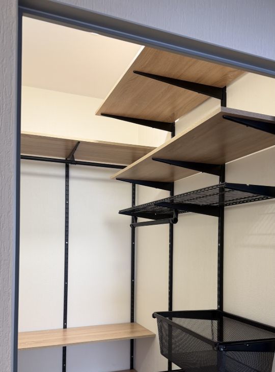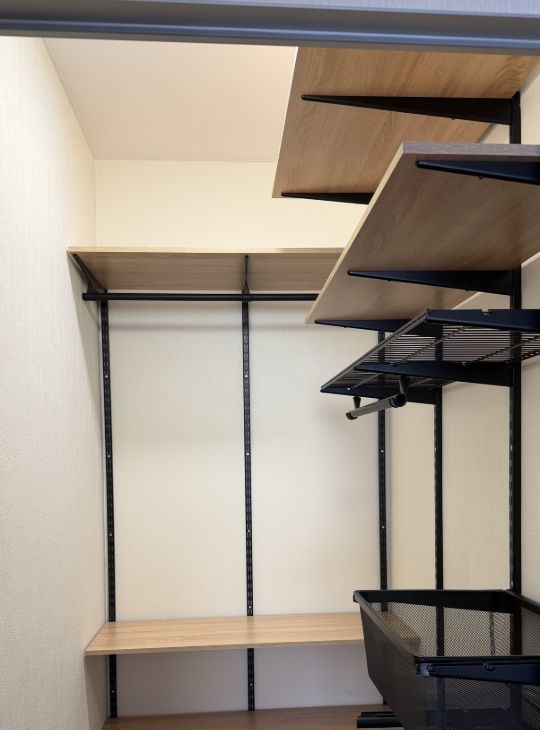 Гардеробная, в которой установлена гардеробная система, которую можно легко адаптировать: добавить или убрать полки и организовать пространство под свои потребности.