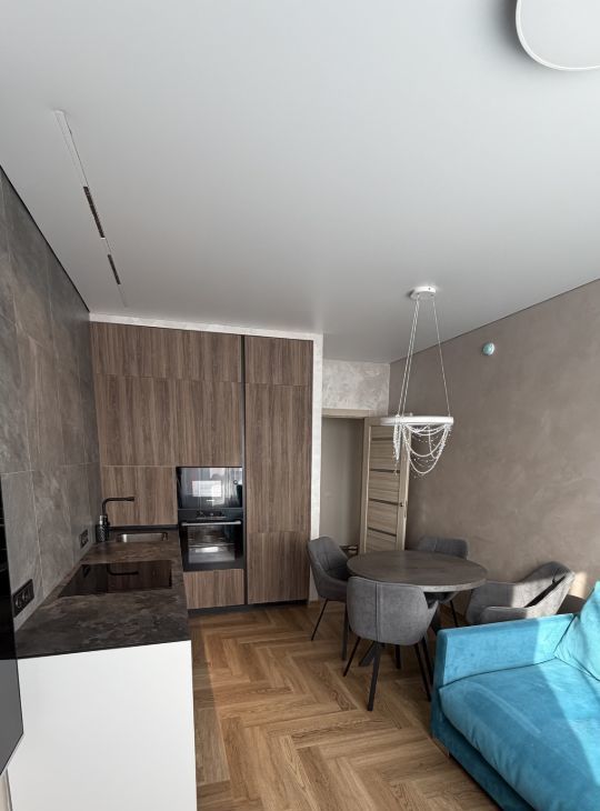 Кухня оборудована кондиционером и кухонным гарнитуром, выполненным на заказ из качественных материалов и фурнитуры. Установлена встроенная техника: посудомоечная машина, индукционная варочная панель, духовой шкаф, микроволновая печь и холодильник.