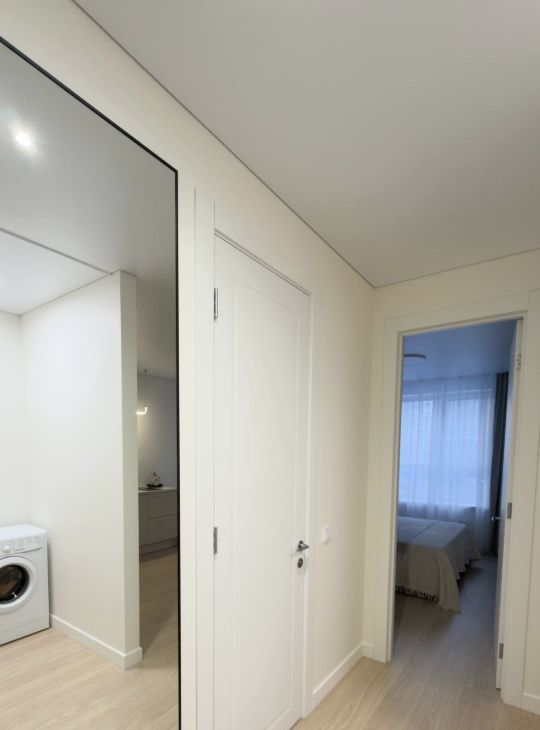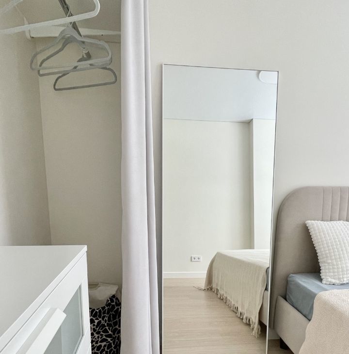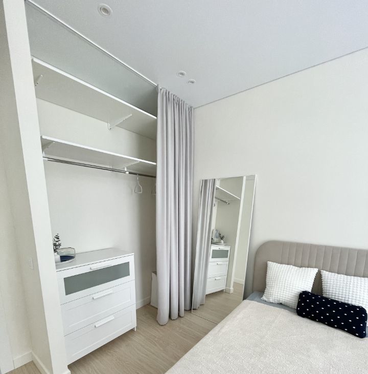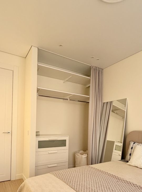 Полноценная огромная гардеробная в спальне с зеркалом) при желании зеркало может перемещаться по квартире . Вы сможете создать интерьер под себя