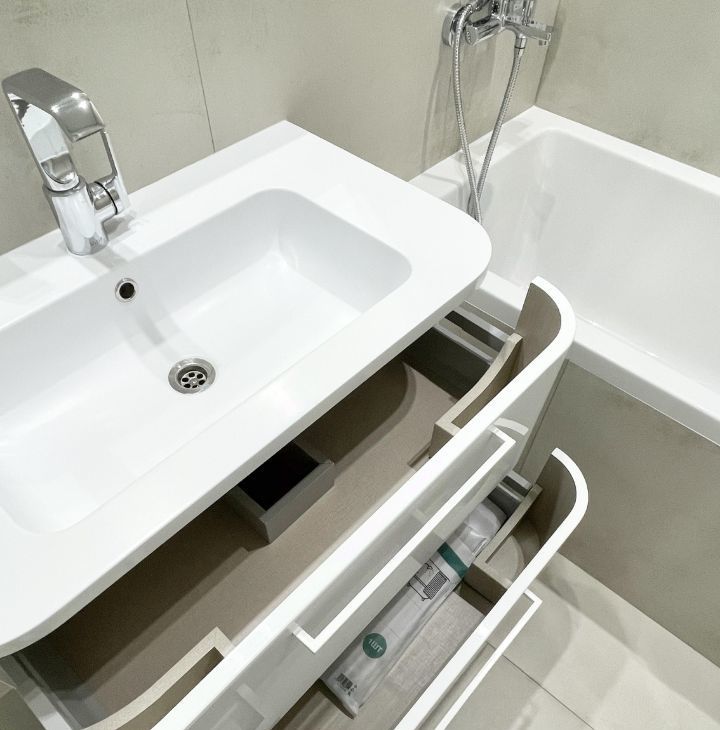 В ванной тёплый пол и полотенцесушитель, очень удобная тумба для хранения принадлежностей . Ночная подсветка .