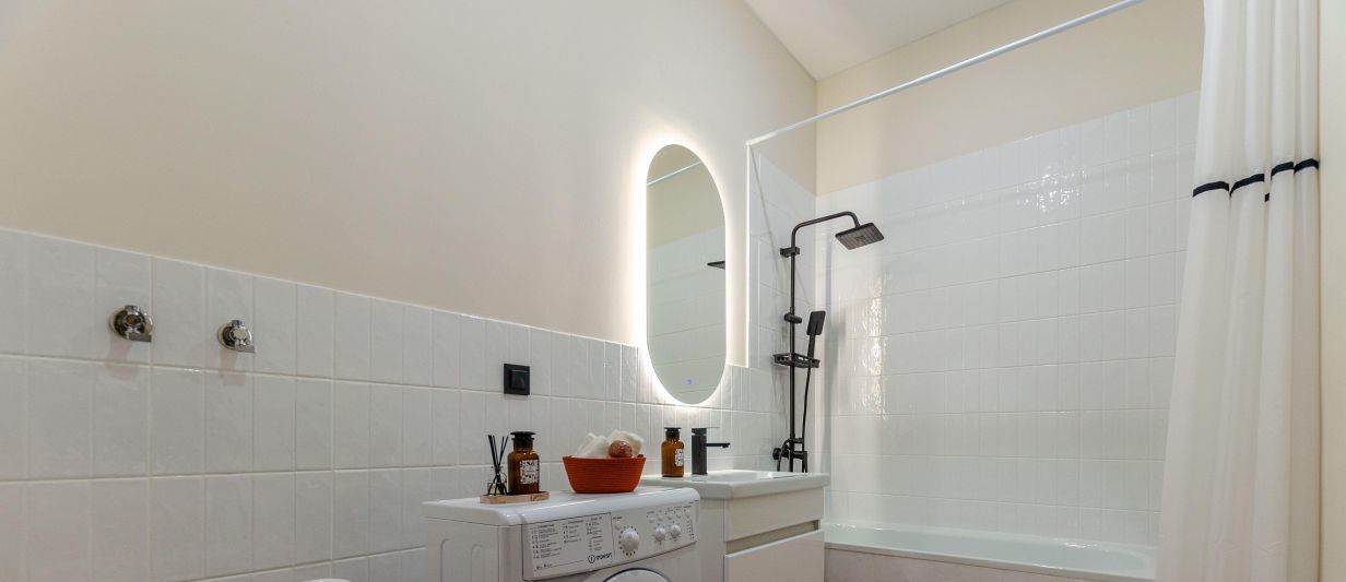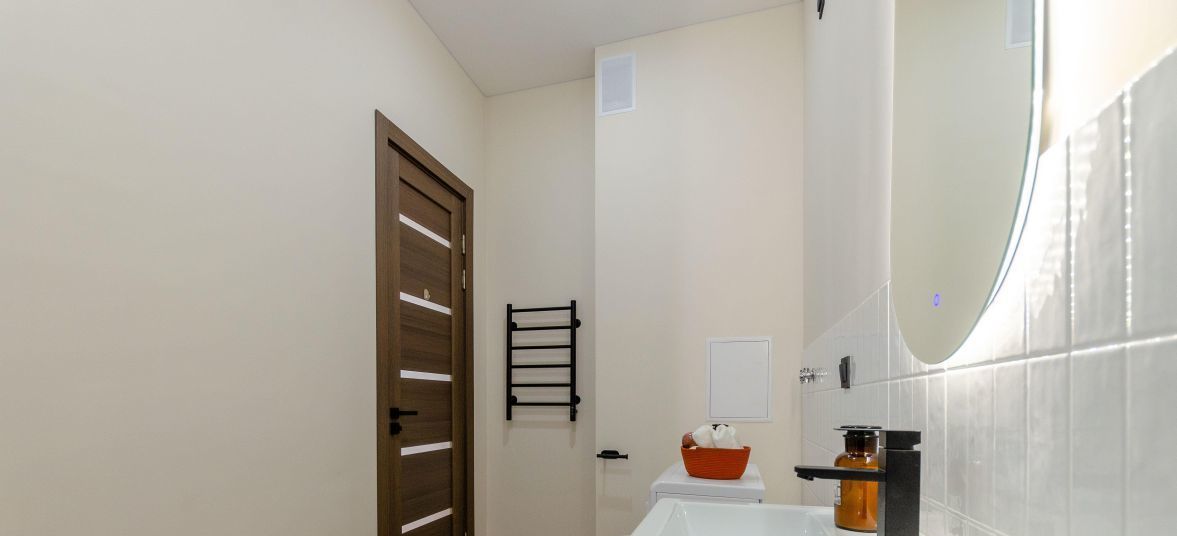 совмещенный санузел с ванной, тропическим душем, зеркало с подсветкой, ручной отпариватель, эл.полотенцесушитель и напольная сушка для белья, стир. машина.