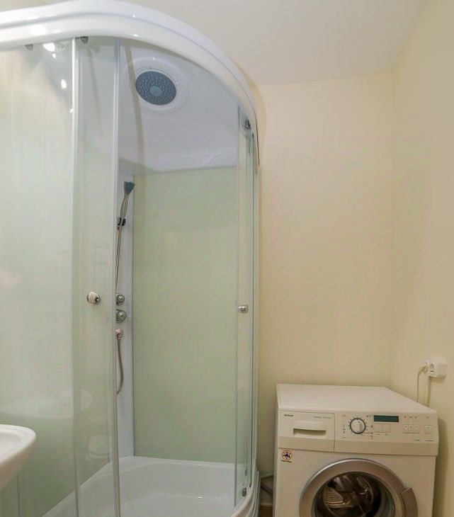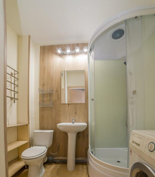 Полностью обустроенная квартира: мебель, кухонный гарнитур с бытовой техникой, стиральная машина.