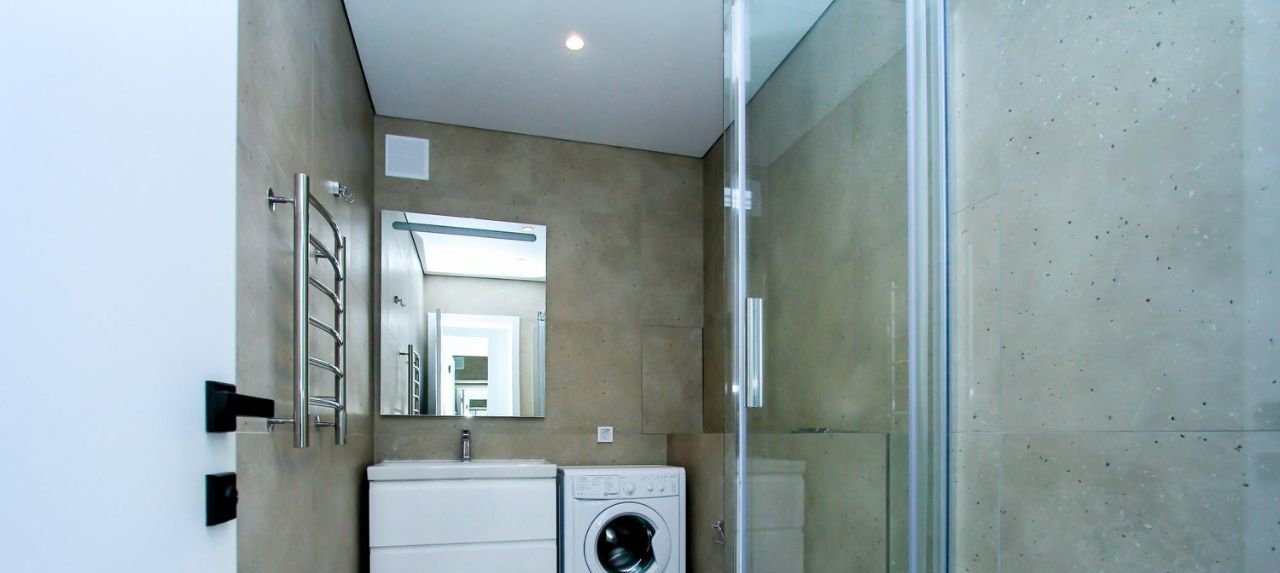 В студии совмещенный санузел с душем, стиральной машиной, а также раковиной с зеркальной подсветкой.