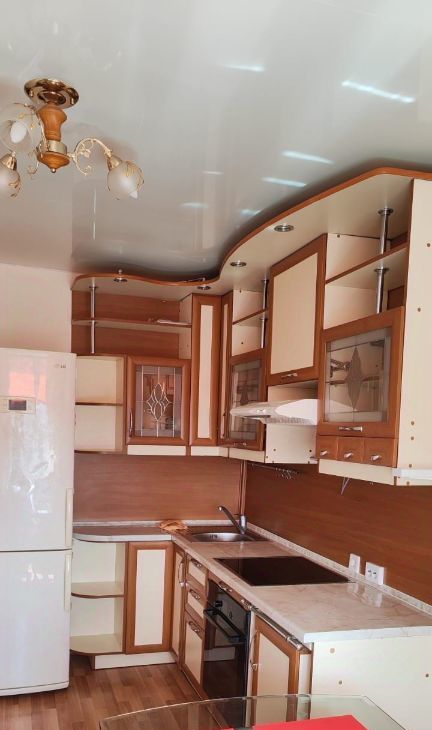 Кухня оборудована всей необходимой техникой: варочная поверхность, духовой шкаф, холодильник, обеденная зона, диван. В квартире есть просторная гардеробная.