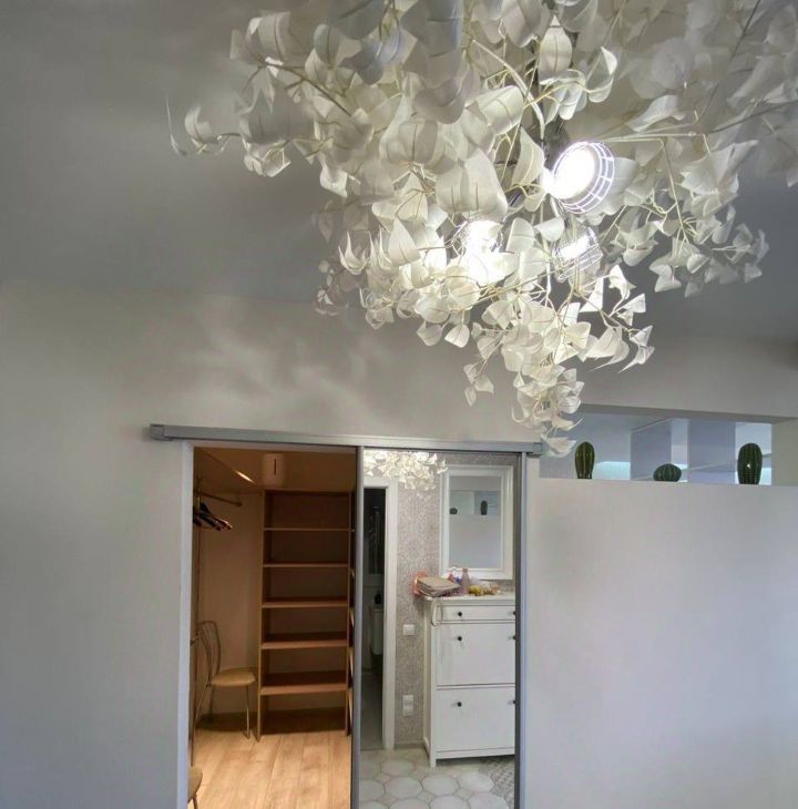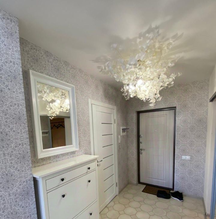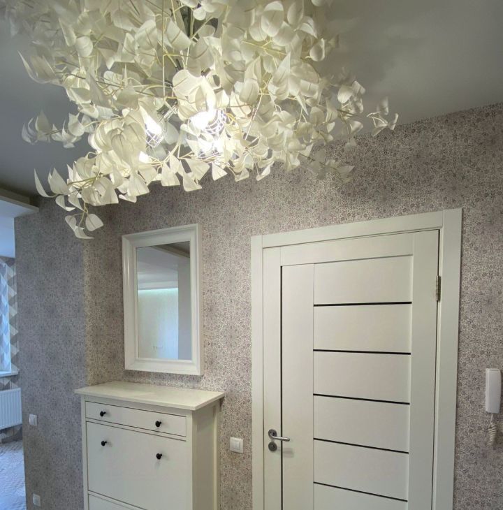 В квартире продумано освещение, подсветка зон, дизайнерская люстра в прихожей в форме цветка.