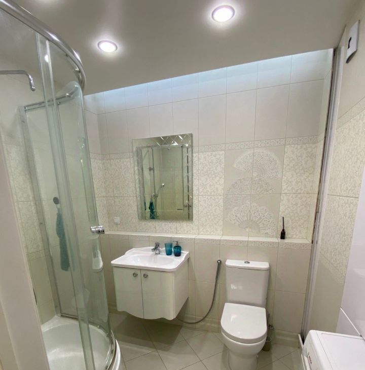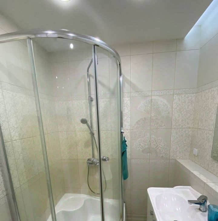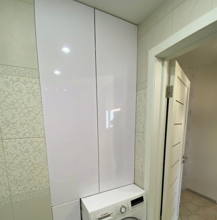 В ванной плитка, душевая кабина, шкафы для хранения.