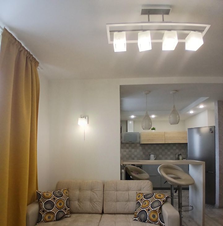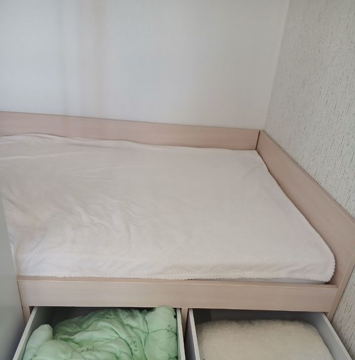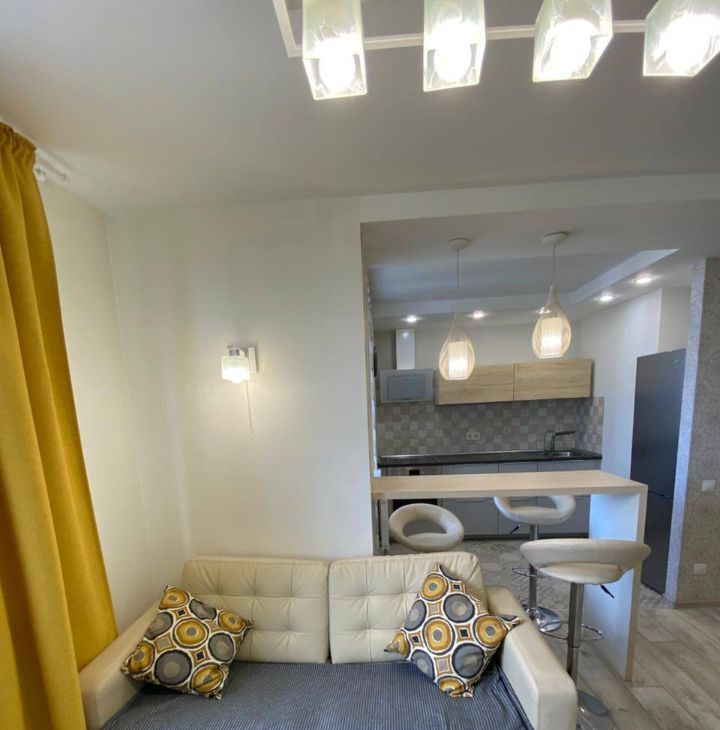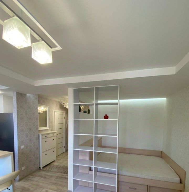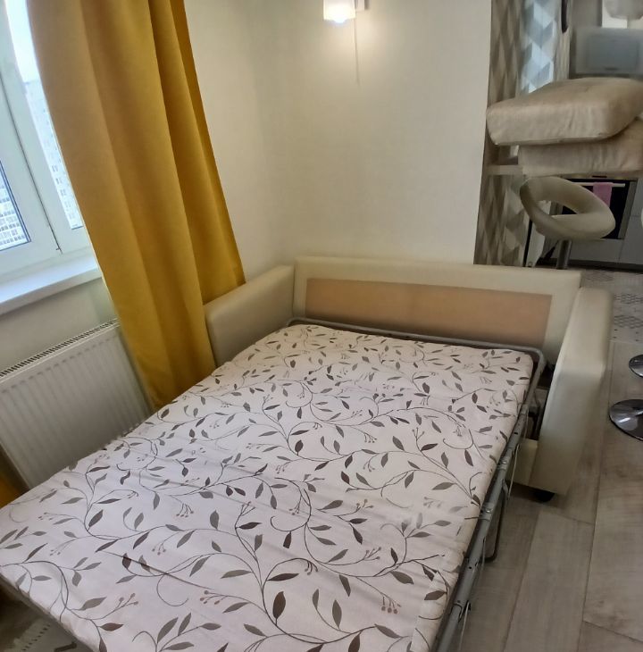 Вся мебель на фото в наличии: кухонный гарнитур икея,оборудован варочной панелью и духовым шкафом, двуспальная кровать с ортопедическим матрасом и ящиками для хранения, диван (раскладывается),стол, барная стойка, 3 барных стула, стеллаж.
