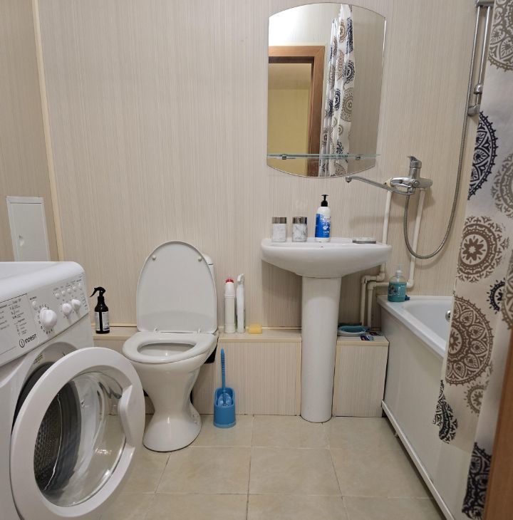 Кухня оборудована необходимой техникой, включая холодильник и микроволновую печь. В комнате установлены шкафы и телевизор. Стиральная машина 2024 года выпуска