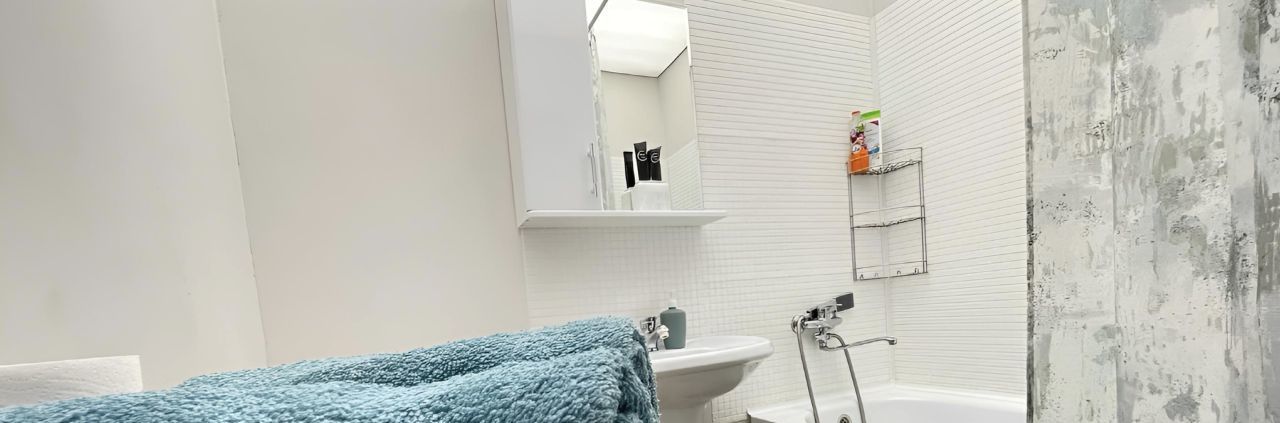 В квартире есть удобная система хранения вещей . Большой плательный шкаф, ТВ. Санузел с ванной и стиральной машиной.