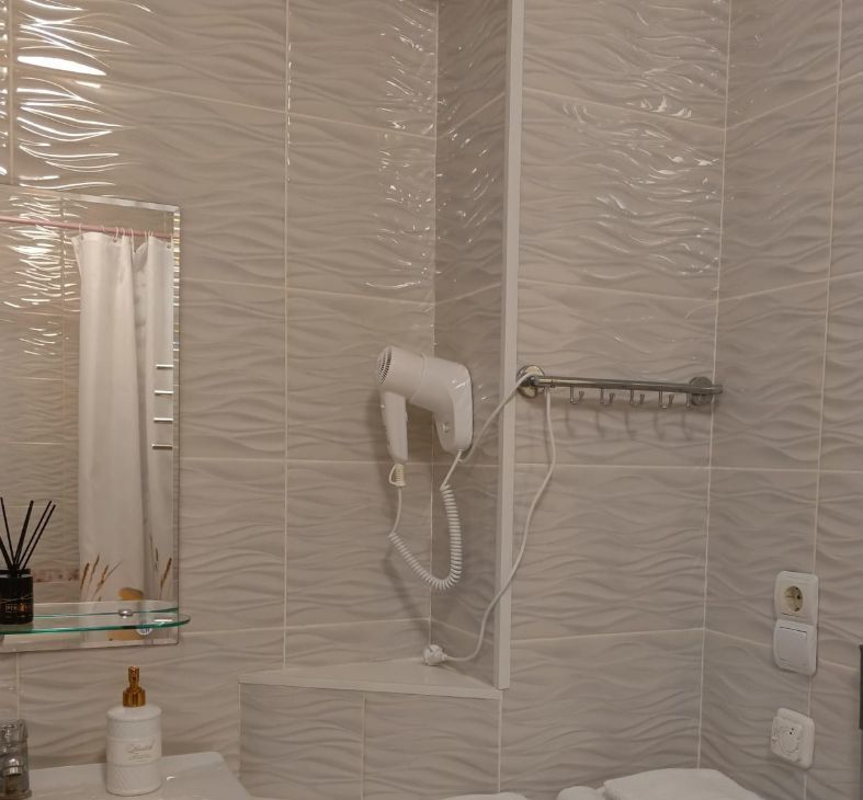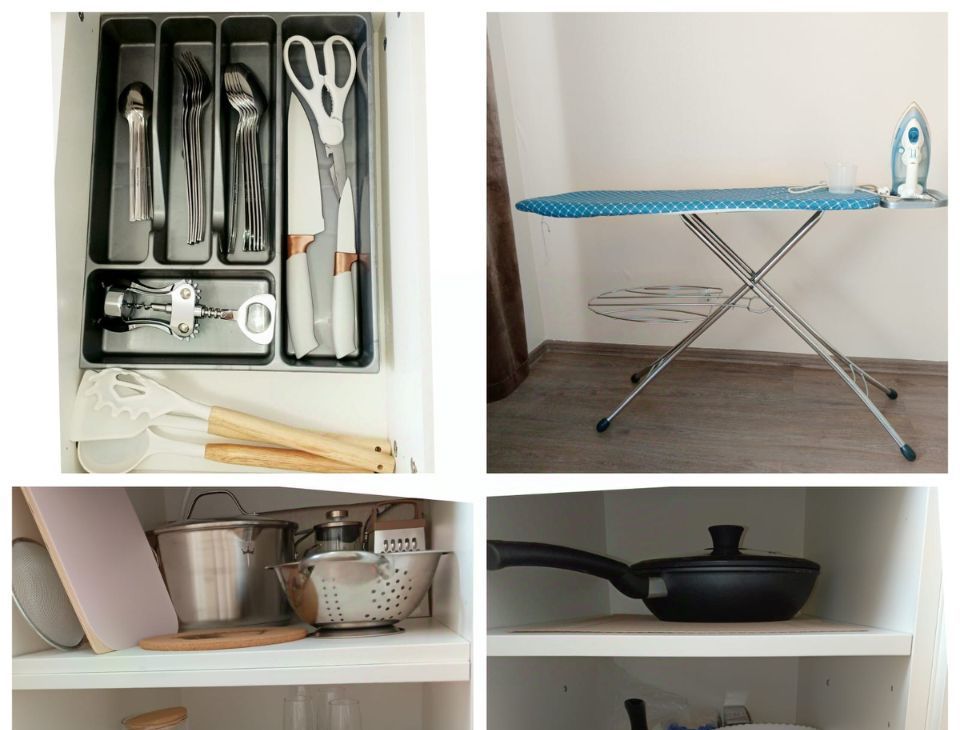 Утюг, гладильная доска, сушка для белья, фен, стиральная машина, гигиенический душ.