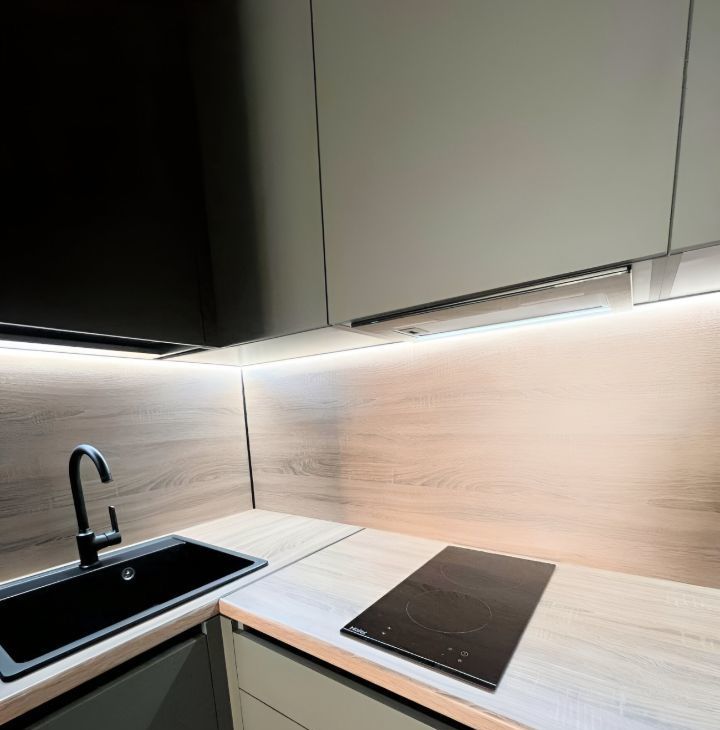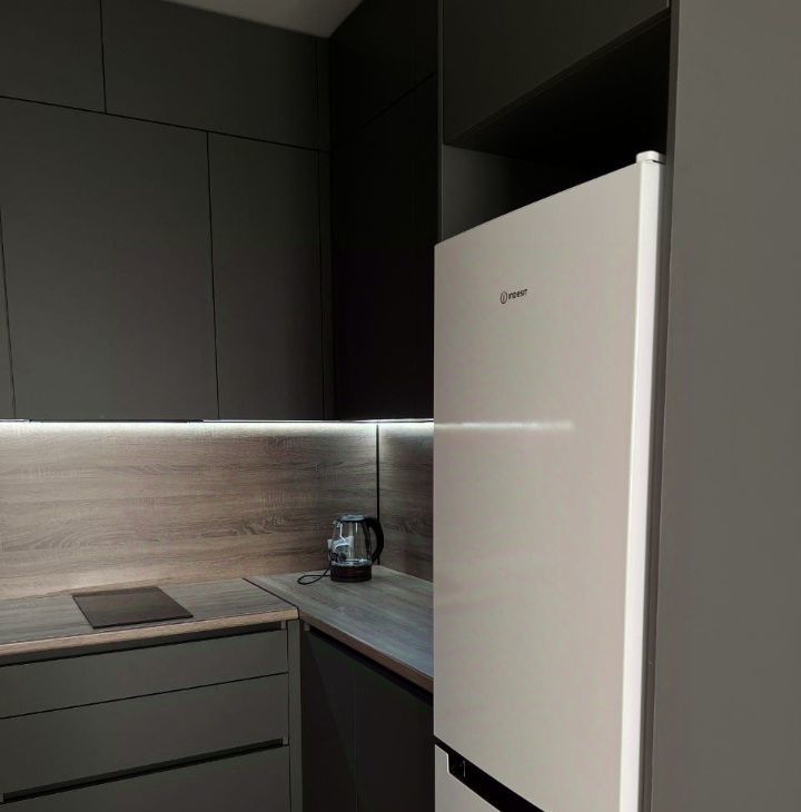 В квартире: кухонный гарнитур, холодильник, варочная поверхность, вытяжка, диван, комод, телевизор, шкаф, стиральная машина.
