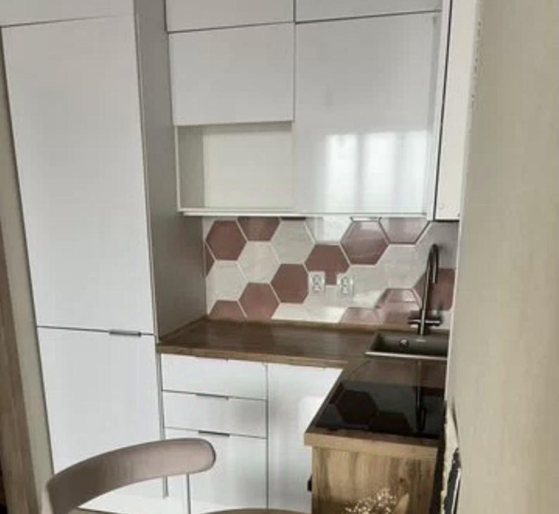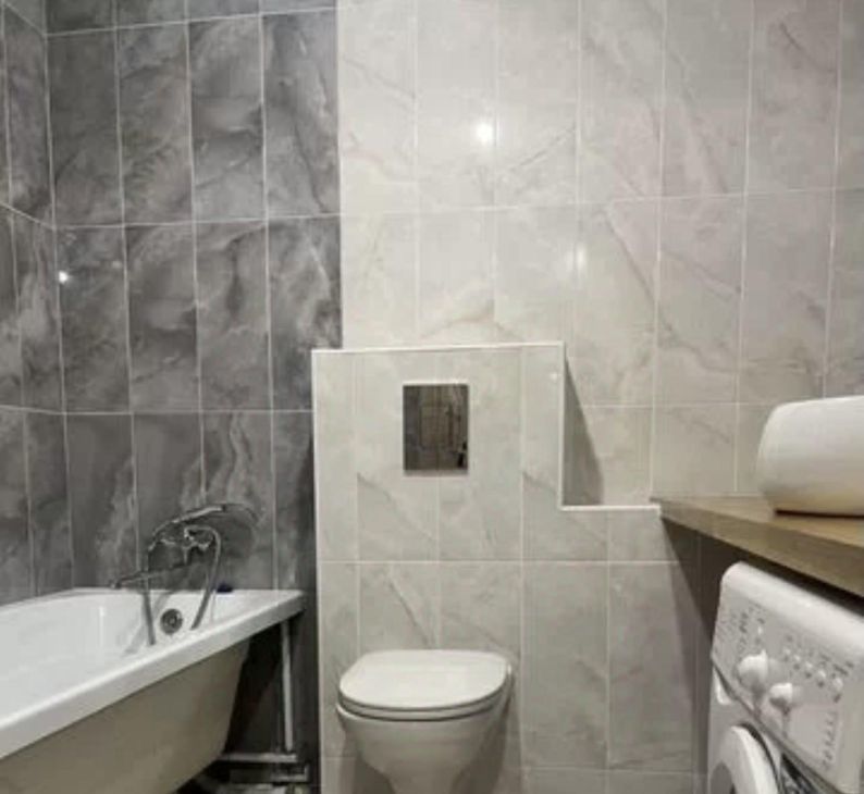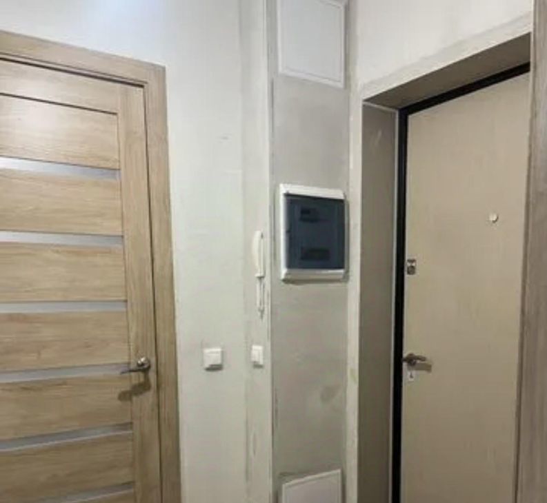 В квартире выполнен свежий евро ремонт. Просторная кухня площадью 9 м² оборудована необходимой техникой, включая холодильник. Из мебели установлены шкафы и диван. Санузел совмещенный, оформлен стильной плиткой.