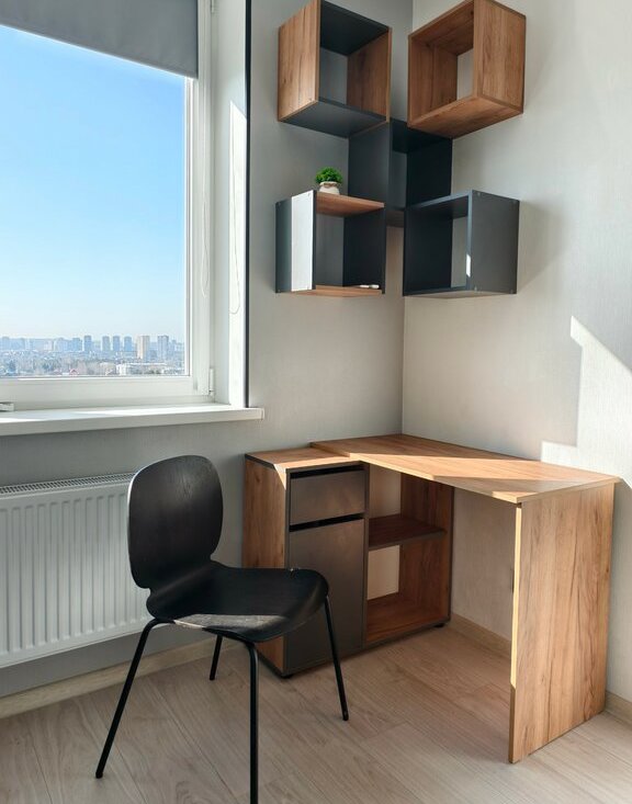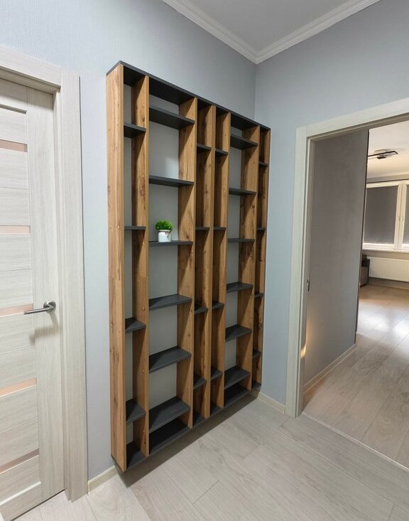 Мебель: кухонный гарнитур, два дивана, шкаф, кухонный стол и стулья, рабочий стол, журнальный столик, стеллажи, прихожая, обувница, полки для хранения.