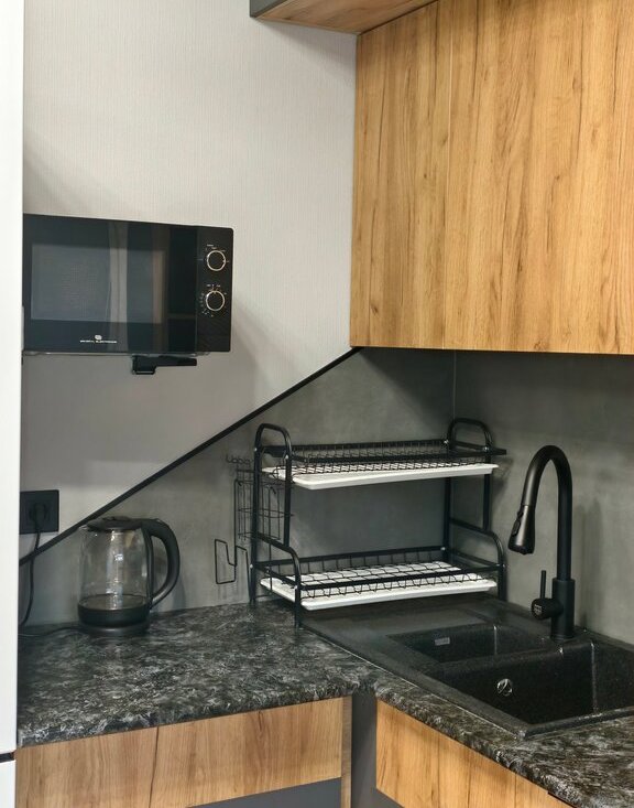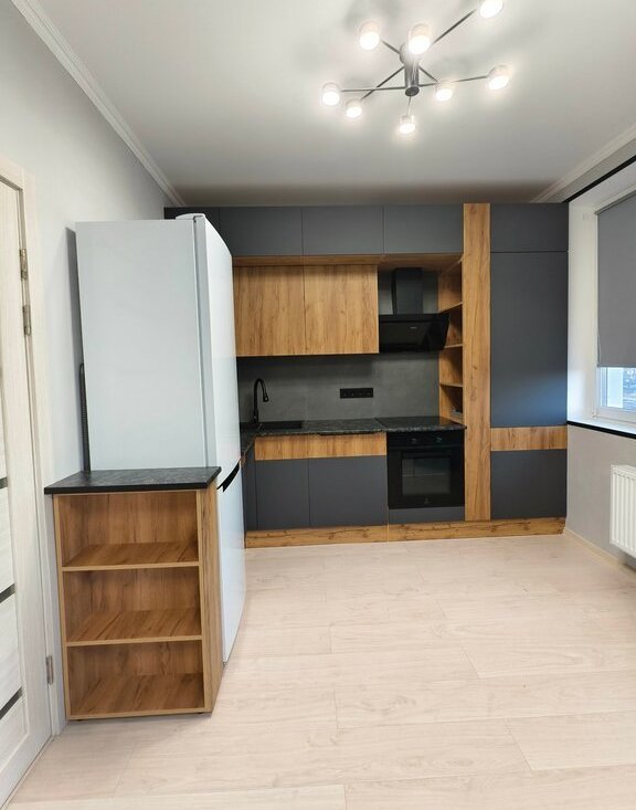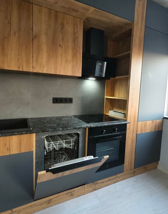 Техника: холодильник, варочная панель, духовой шкаф, вытяжка, микроволновка, посудомоечная машина, стиральная машина, кондиционер, телевизор, роутер.