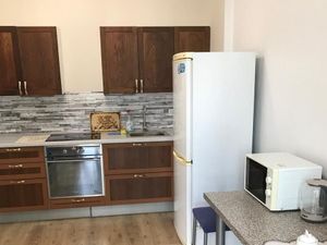 кухня - гостиная Кухонный гарнитур, варочная панель, духовой шкаф, микроволновая печь, кухонный стол и стулья, качественный диван, холодильник