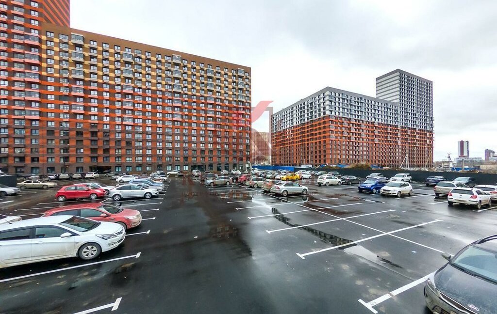 Возле подъезда у дома расположена большая открытая автомобильная парковка.