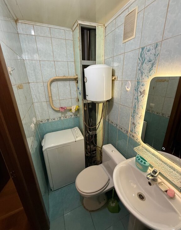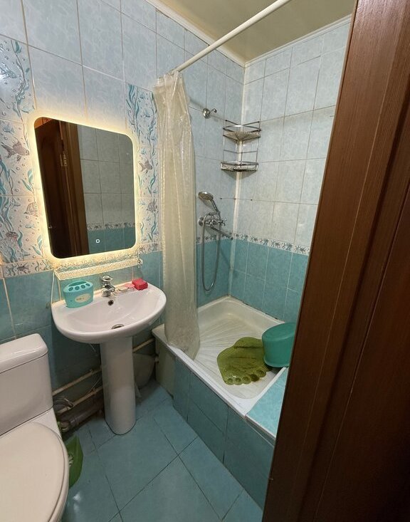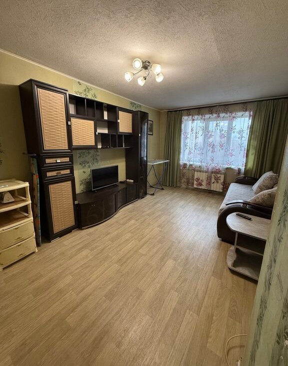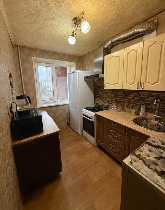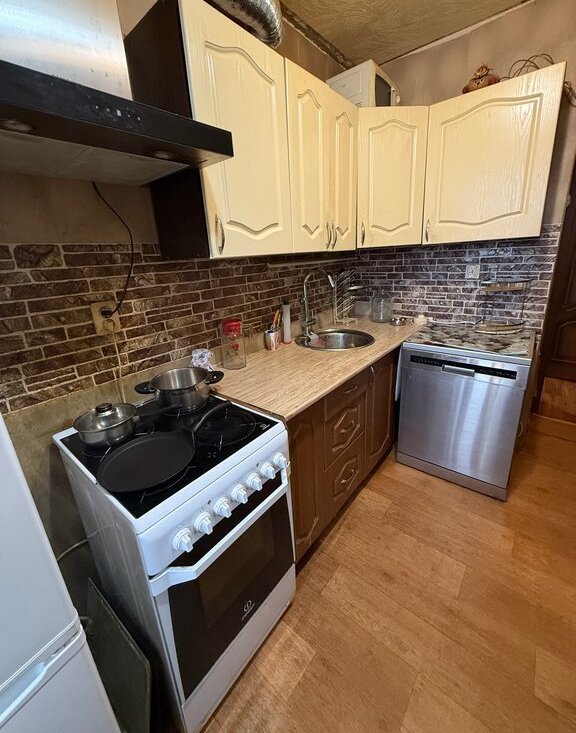 Квартира предлагается без ремонта, но в ней есть вся необходимая мебель и техника для комфортного проживания. В кухне установлена мебель, холодильник и посудомоечная машина. В комнате имеется мебель и телевизор. Ванная комната оборудована душевой кабиной и стиральной машиной.