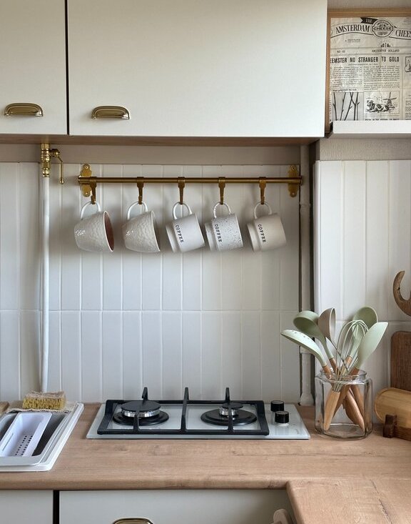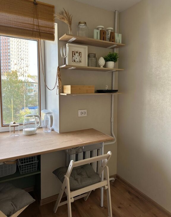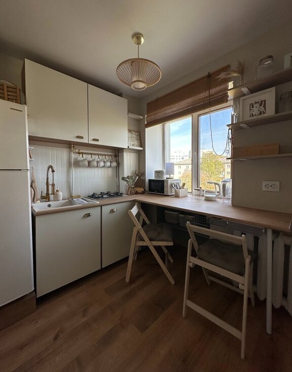 Небольшая, но функциональная кухня. Компактная газовая плита и встроенная стол-столешница дают достаточно пространства для комфортного размещения.