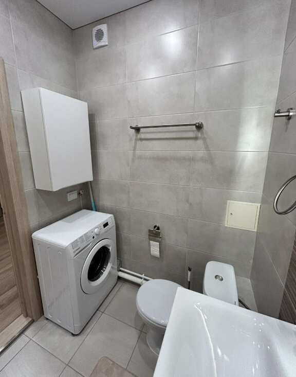 Есть все необходимое для проживания. В комнате раскладной диван, большая кровать с ортопедическим матрасом. Для хранения вещей оборудована гардеробная, есть шкаф, комод. На кухне полностью укомплектованный кухонный гарнитур, электроплита, вытяжка, холодильник, микроволновка, посудомойка, чайник и прочие мелочи для жизни. Санузел совмещенный, ванна, стиральная машинка - все подключено и работает.