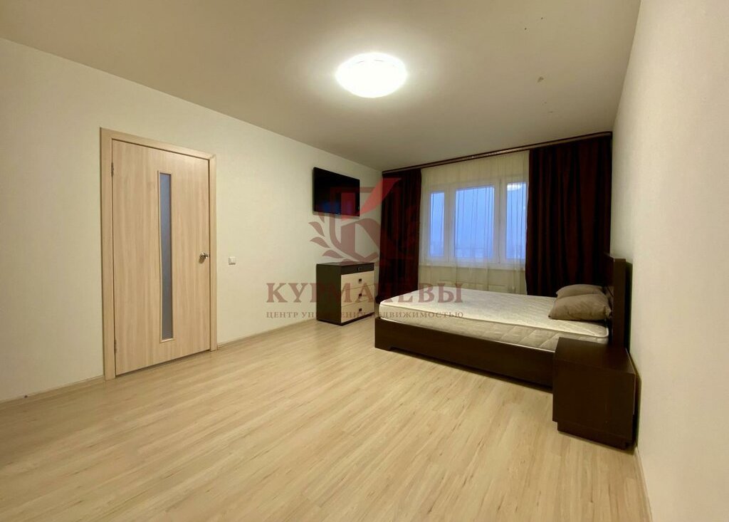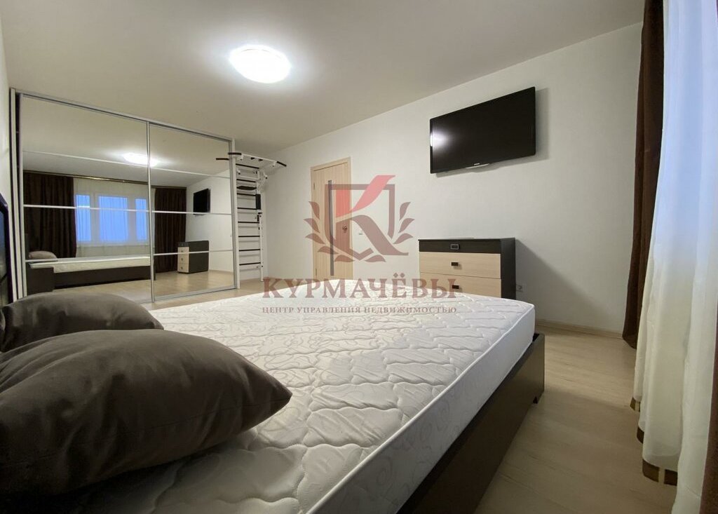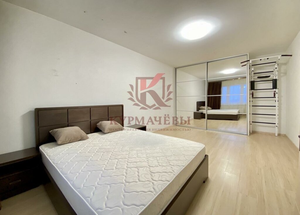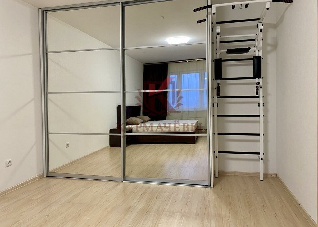 2) В спальне: двуспальная кровать с матрасом и изголовьем, телевизор, комод, прикроватные тумбы, шкаф - купе с зеркалом и спортивная стенка с турником.