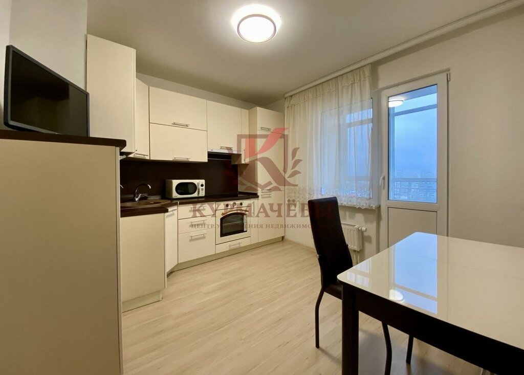 1) Кухня оборудована: электрическая варочная поверхность и духовка, вытяжка, встроенный холодильник, микроволновка, телевизор, чайник. Имеется кухонный гарнитур с раковинной и смесителем, обеденный стол и стулья