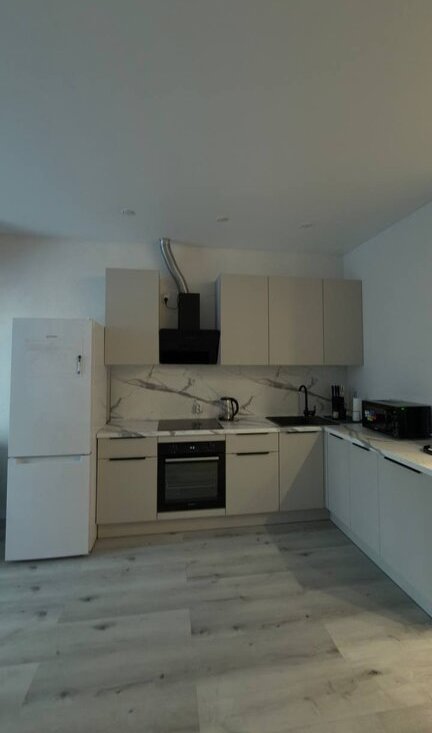 Кухня: стол и два стула для приятного ужина, холодильник, микроволновка, духовка, вытяжка, чайник.